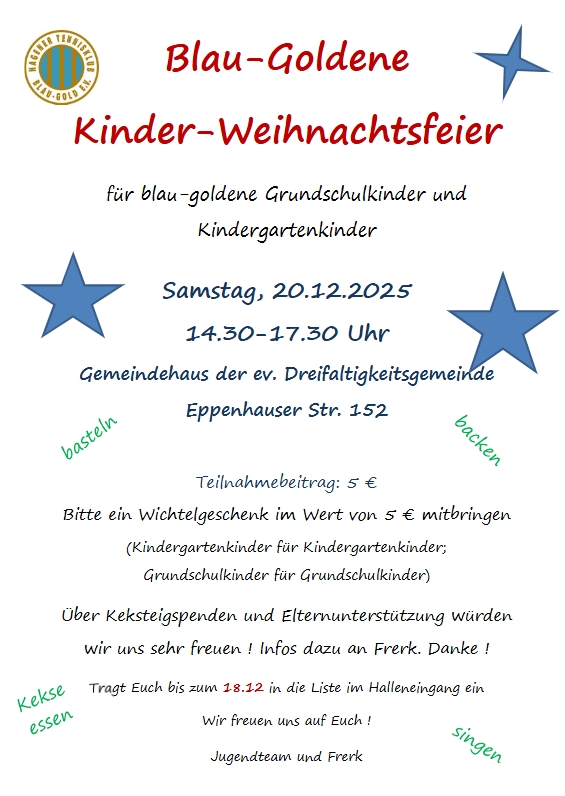 Aktuelle und kurzfristige Ankündigung: Kommenden Samstag, den 20.12.2025 findet von 14.30 Uhr bis 17.30 Uhr unsere Kinderweihnachtsfeier im Gemeindehaus der evangelischen Dreifaltigkeitsgemeinde, Eppenhauser Str. 152, statt. Hier wird gebastelt, gebacken, gesungen und ein schöner Nachmittag verbracht. Für weitere Infos kontaktiert bitte Frerk Meiners per mail oder SMS (siehe auch Bild 2).